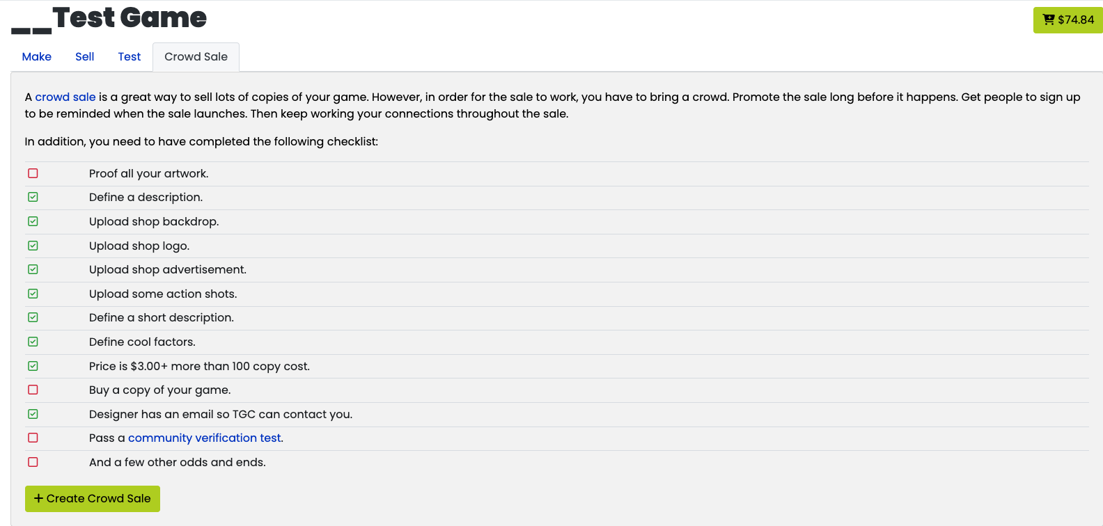 After you click on the "Crowd Sale" tab, you will be taken to a checklist. If any item on the list is not checked off, then you will need to make those changes to your game. If all the items are checked off, then you will be able to move to the next step by clicking on "+Create Crowd Sale."