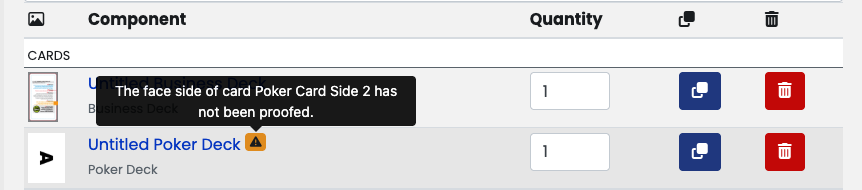 When there are images in a component set that need to be proofed, you'll see an orange rectangle symbol with a black triangle in it. If you hover your cursor over this symbol, you'll see a message about which components need to be proofed.