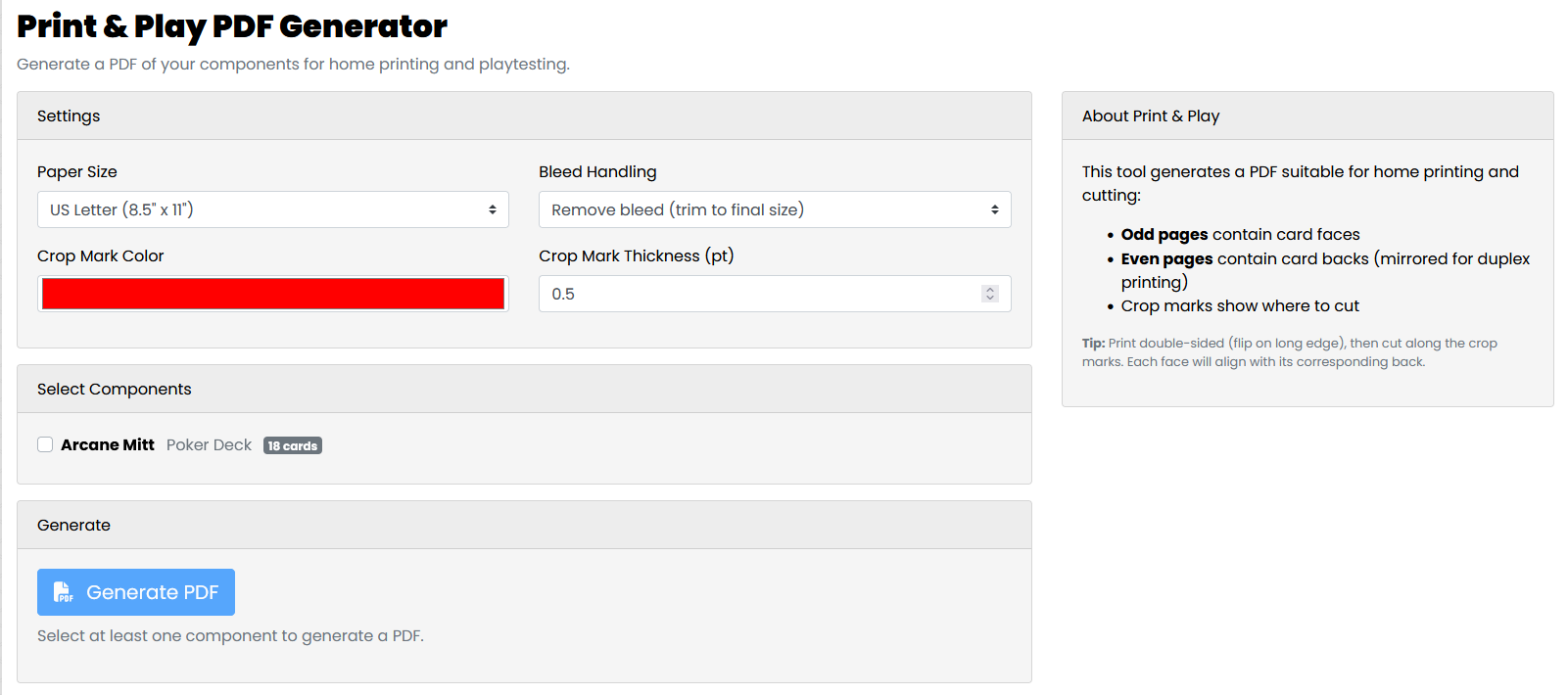 Clicking Print & Play PDF will take you to a page where you can select your game size and the items you wish to include: