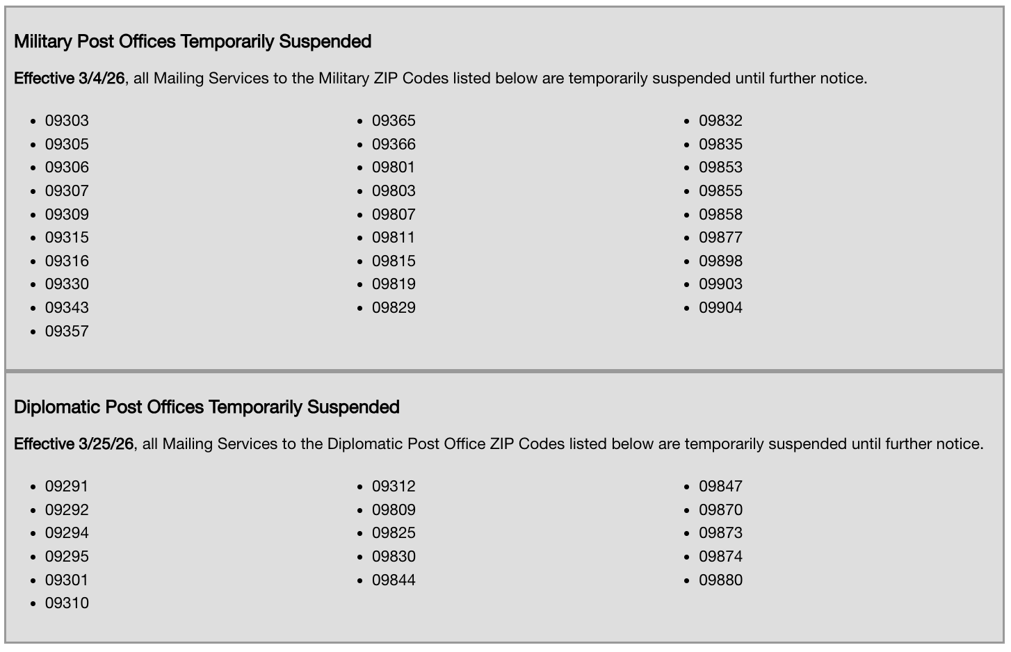 Due to recent conflicts, USPS is unable to ship to a number of APO, FPO and DPO postal codes effective immediately.